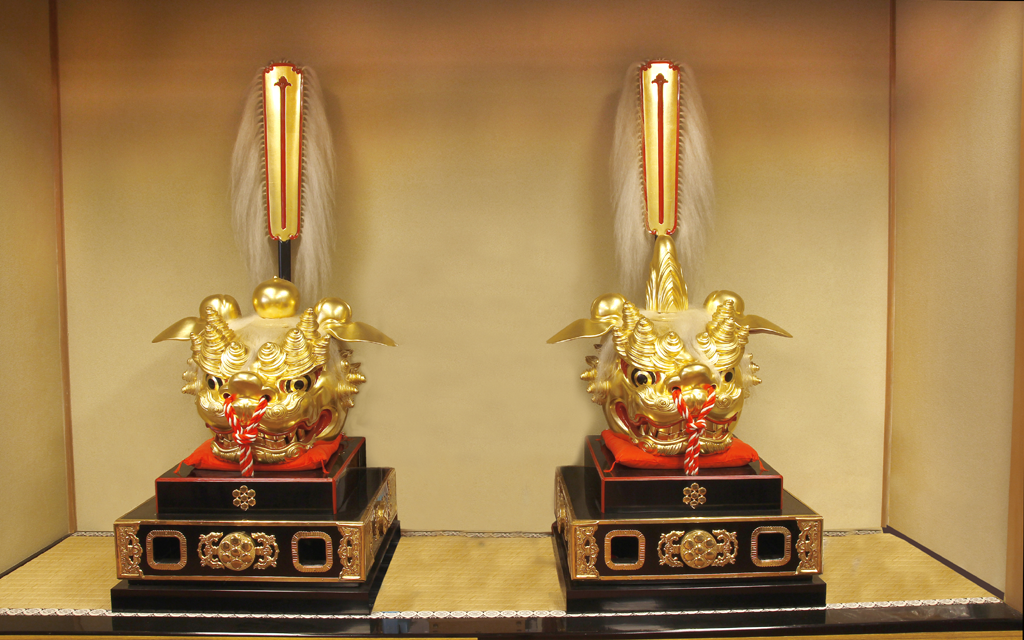 もともとはこの獅子頭は御輿として担いたものです。この度の遷宮工事に際して、これまでの塗りをはがして金箔を張り、床の間の飾りとしました。